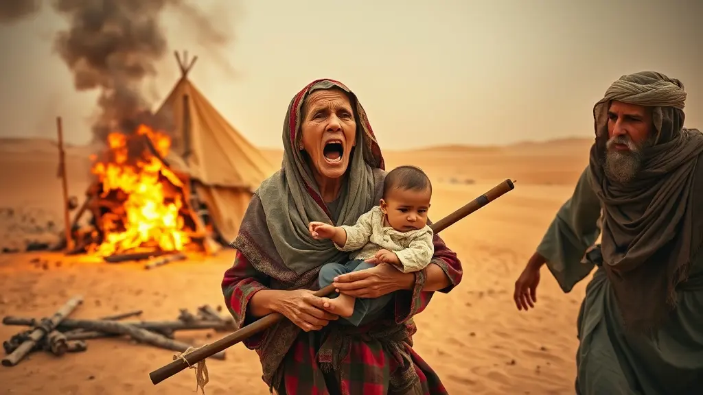 امرأة  بدوية كبيرة   تصرخ  معها عكاز    تحمل طفل رضيع  يسوقها  رجلان  عنوة تنظر بقلق الى بيت شعر  يحترق في الصحراء