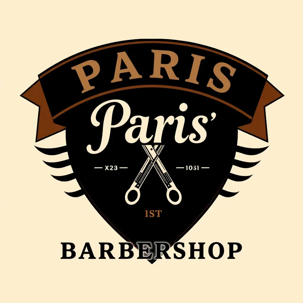 شعار صالون حلاقة رجال بأسم باريس بل انجليزي بلون البني والكستناء والاسود