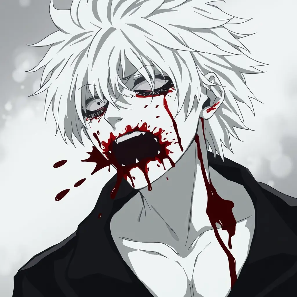 شخص حزين وخائف وملطخ بالدم في الانمي ابيض واسود وشعره ابيضوالدم يخرج من جسده وجامد