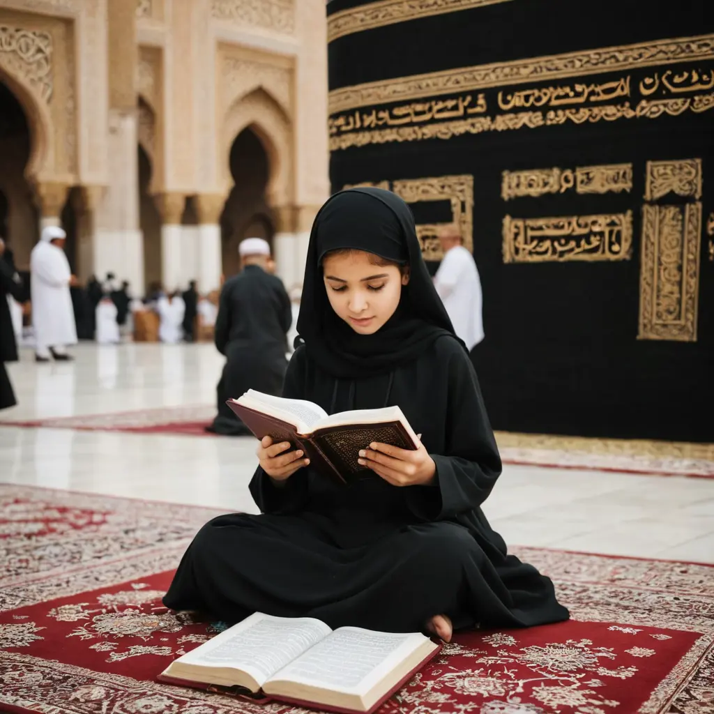 صورة بنت تقراء القرآن الكريم عند الكعبة