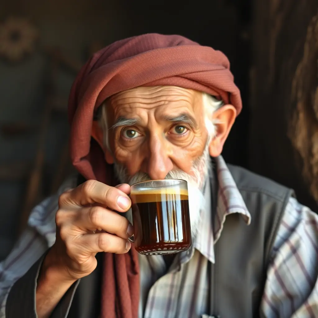 فلاح مصري قديم في العمر يقوم بشرب القهوه التركي وهو في غايه السعاده