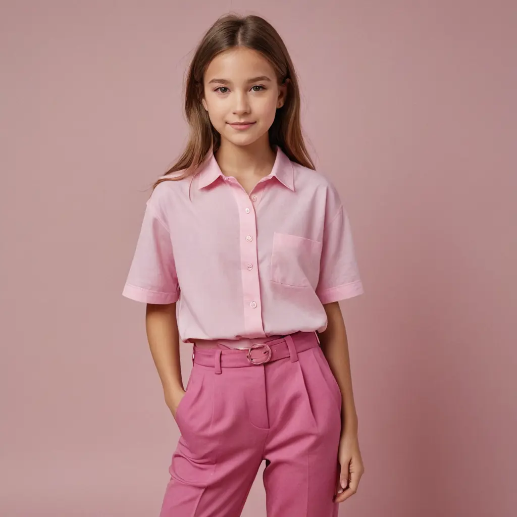 صورة فتاة ترتدي قميص وردي وبنطلون وردي