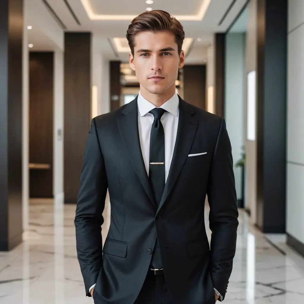 التقط صورة لرجل يرتدي بدلة سوداء كلاسيكية، يقف بثقة في ردهة مكتب عصري يغمره ضوء النهار الطبيعي. تمتلئ الأجواء بجدران زجاجية أنيقة وأرضيات رخامية مصقولة، مما يخلق بيئة احترافية وراقية. التقط تفاصيل قميصه الأبيض الناصع وربطة عنقه الحريرية الداكنة، مع التركيز على تعبيراته الواثقة. حوّل هذه الصورة إلى لوحة رقمية عالية الدقة بألوان زاهية وظلال ناعمة تُبرز ملمس ملابسه والأجواء الفاخرة.