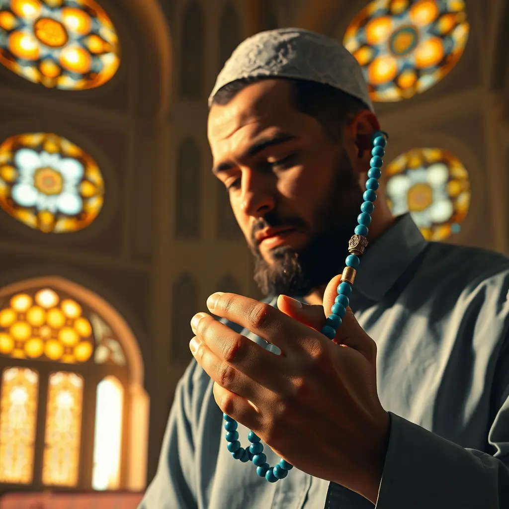 رجل مسلم يحمل مسبحة زرقاء سماوية، يُركز باهتمام على يديه بينما يُسبح بحمد الله من خلال إيقاعات حبات الصلاة. المشهد عبارة عن مسجد تقليدي أثناء صلاة المغرب، حيث يتسلل ضوء ذهبي دافئ عبر نوافذ زجاجية ملونة معقدة، مُلقيًا بريقًا هادئًا على الرجل ومُبرزًا حبات الحبات الرقيقة. ينبغي التقاط هذه الصورة بأسلوب لوحة رقمية مُفصلة، مع التركيز على التركيز الدقيق والقوام الواقعي لتُجسد الصلة الروحية العميقة بين الرجل وإيمانه.
