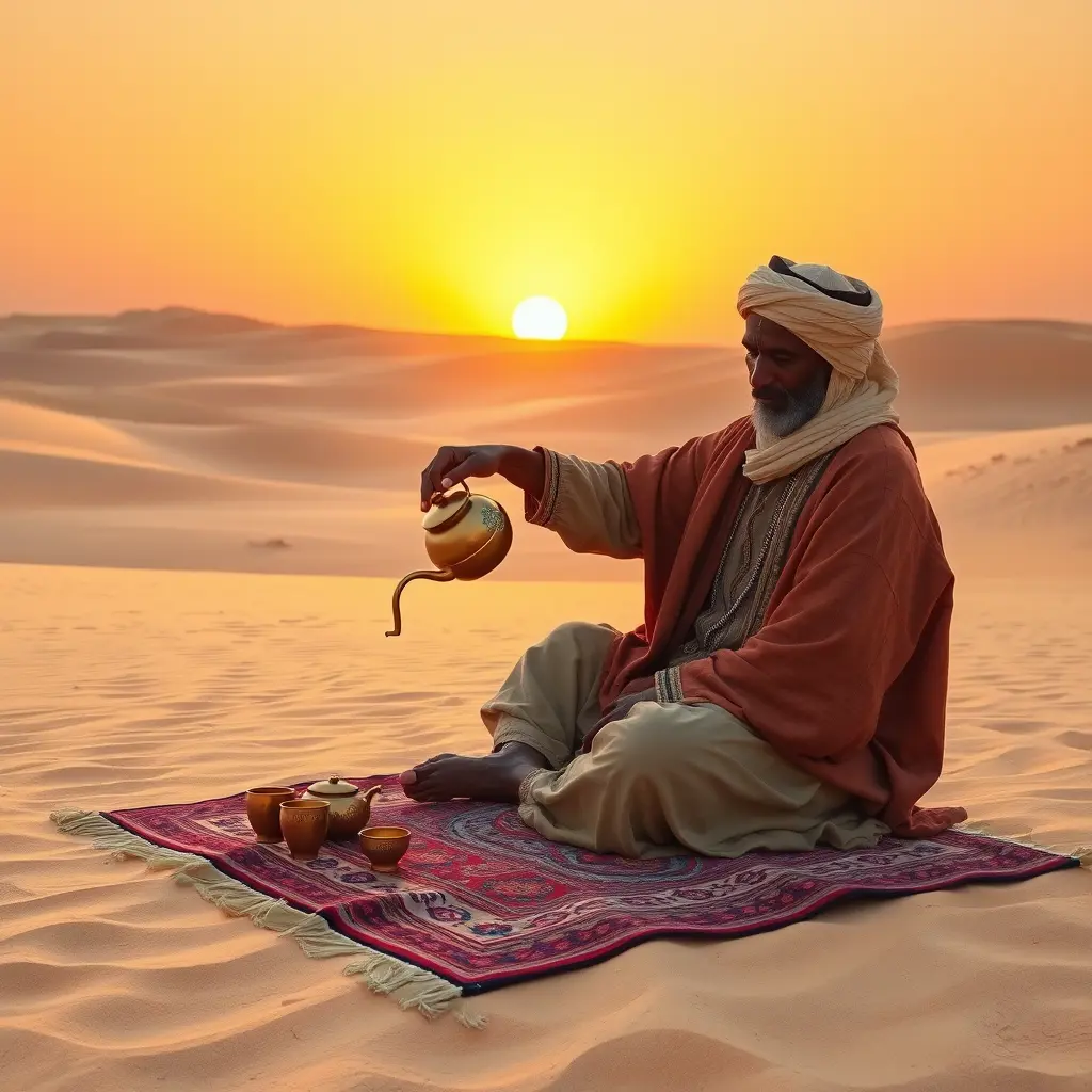 يجلس رجل ليبي من قبيلة الطوارق متربعًا على سجادة ناعمة منسوجة بإتقان في الصحراء الشاسعة عند غروب الشمس. تمتد كثبان الرمل الذهبية خلفه بلا نهاية وهو يصبّ الشاي بشكل احترافى في كوب نحاسي تقليدي مستخدمًا إبريق شاي طويل المقبض. تُلقي الشمس الغاربة بوهج برتقالي دافئ على المشهد، مُبرزةً ثراء نسيج ثوبه المزخرف وتصاميمه الدقيقة على الأكواب. التُقطت هذه الصورة بأسلوب رسم رقمي مُفصّل، مُبرزةً التراث الثقافي والهادئ لقبيلة الطوارق.