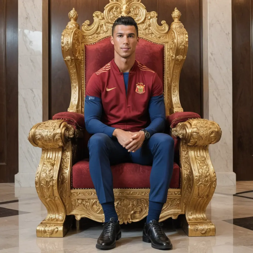 كرستيانو رونالدو يجلس علي العرش الضخم المهيب الفاخي وبجانبه كأس العالم لكره القدم وتحت اقدامه اللاعب مسي ينظف حذاءه
