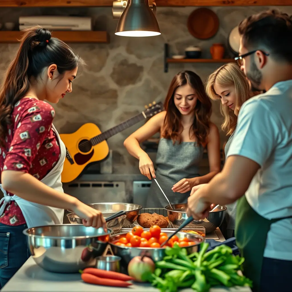 international european mix gender group cooking together. In the back one Asian woman is playing guitar
