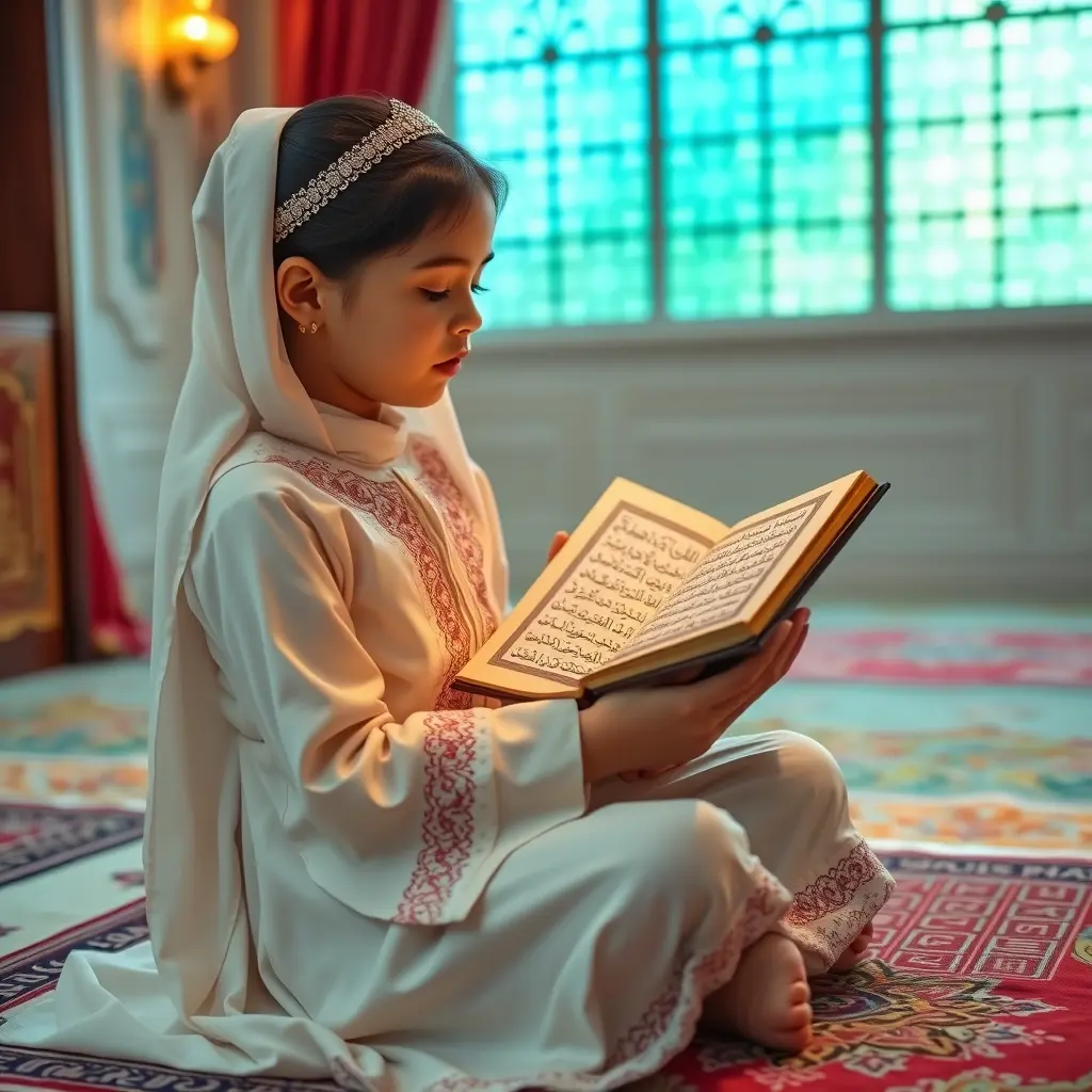 فتاة. جميلة تحمل المصحف الكريم و تدعو الله وتجلس على شهادة في غرفة جميلة كأنها حقيقية وتلبس طقم الصلاة