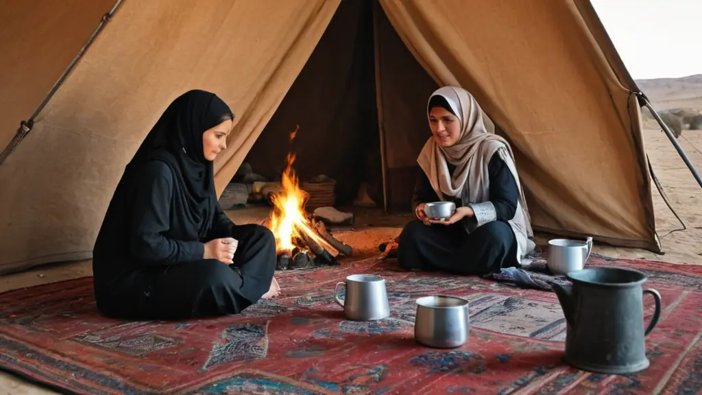 خيمة بدوية،ونساء تلبس اللبس البدوي داخل الخيمة،يقمن باعمالهن اليومية.خارج الخيمة حصان وجمل،ونار عليها القهوة.اريد صورة طبيعية