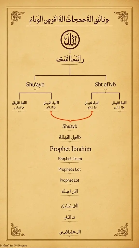 "A family tree showing the prophet Shu'ayb linked to Prophet Ibrahim and possibly Prophet Lot, in a beautiful parchment-style diagram with ancient Arabic design"