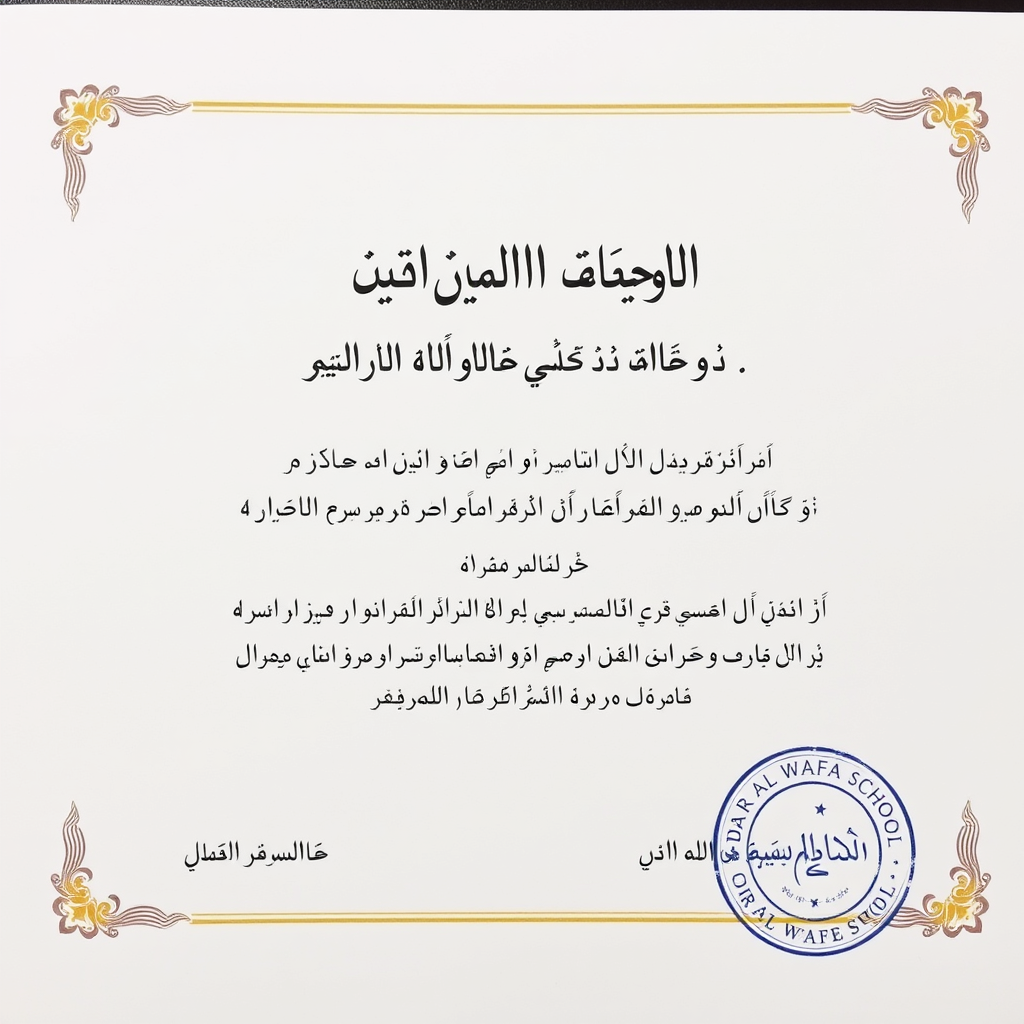 شهادة شكر وتقدير باللغة العربية عليها ختم توقيع مكتوب فيه مدرسة دار الوفاء