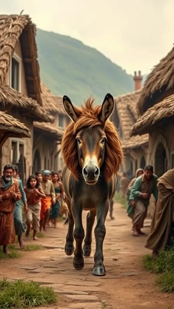 "The donkey arrives at a nearby village, causing fear and terror among the villagers." Prompt: A village with rustic houses, where villagers look shocked and fearful, running away as the donkey, disguised as a lion, approaches the entrance with an imposing stance.