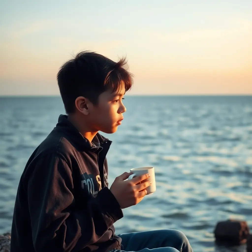 صورة شخص وهو يشرب الشاهي على البحر يكون ولد