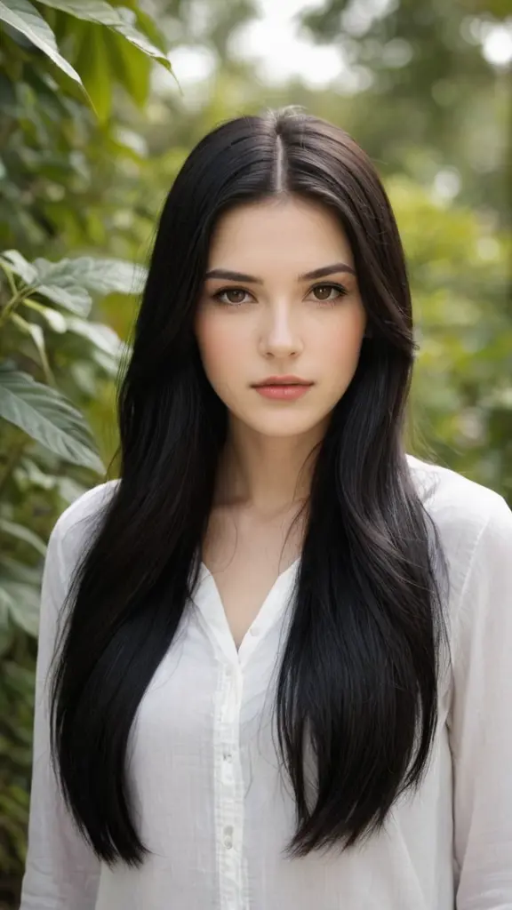 فتاة ذو بشرة بيضاء بشعر اسود و طويل و عين بنيه غامقه و ملامح جميله