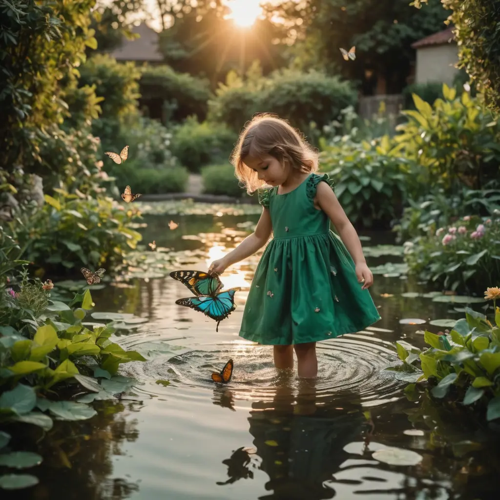 طفلة ترتدي فستان اخضر تلعب بالفراشات وسط حديقة يحيط بها الماء عند غروب الشمس صورة حقيقية منظر سنمائي