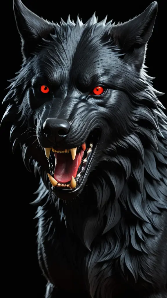 ذئب اسود اللون ثلاثي الابعاد مجسم شرس الملامح ذو عينين حمراء مع خلفيه سوداء يبدو كانه منحوت عليها