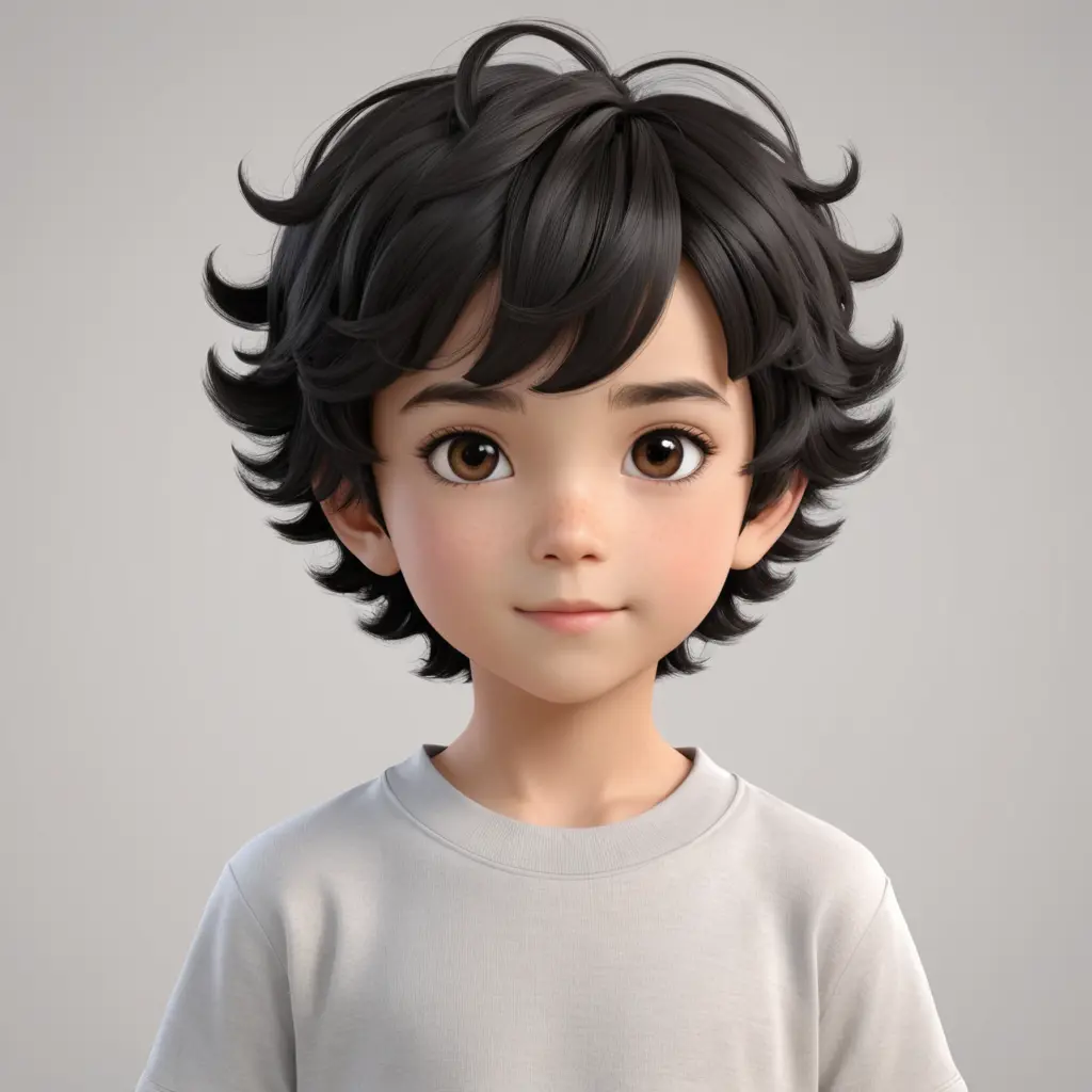 "Generate a cute 7-year-old boy with short curly black hair and bright brown eyes . Ensure high-quality 3D anime style and set the background to white. The aspect ratio should be 16:9."