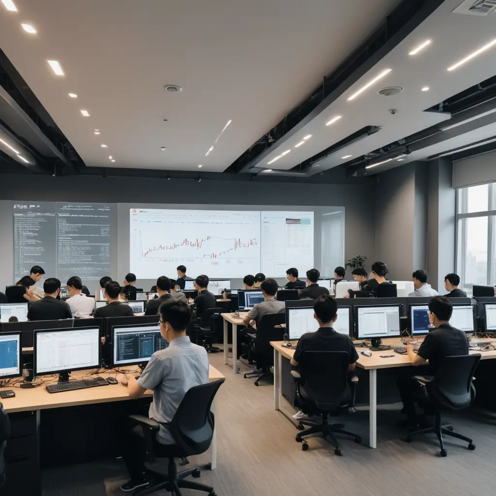 帮我生成一个图片,横向分辨率是1600,竖向分辨率是1000,图片上有一群中国的优秀软件工程师在努力工作,还有他们开发的很多的前端营销活动项目,背后还有一个业务数据快速增长的折线图