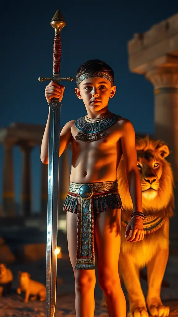 ولد مصري 10 سنوات يرتدىنص الصورةنسخولد مصري 10 سنوات يرتدى مايوه فرعونى عند المعابد الفرعونية القديمة ويمسك بيده سيف مع وضوح عضلات البطن وقت الليل مع إضاءة نيران وبجواره اسد أبعاد الصورةعمودي الموديل المستخدم Flux Fast العرض576 الارتفاع1024 تاريخ الإنشاء14/09/2024 التطبيق المستخدم مولّد الصور تحميل الدقة الكاملةتعديل الصورةولّد صورة مشابهة0