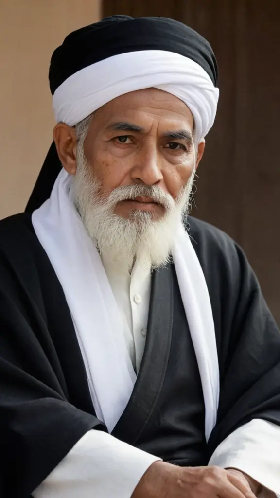 في هذه الصورة، يظهر رجل مسن يرتدي زيًا دينيًا تقليديًا، يتضمن عمامة سوداء وجلبابًا أو عباءة سوداء. له لحية بيضاء كثيفة تغطي جزءًا كبيرًا من وجهه، ويبدو هادئًا ووقورًا، مع نظرة جادة. تعبيره هادئ، ويجلس بشكل مستقيم، واللون الخلفي أبيض بسيط مما يبرز هيئته.