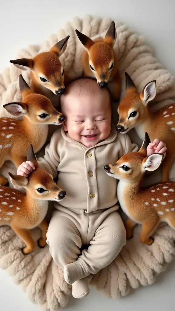 طفل رضيع يرتدي ملابس بني فاتحة، يستلقي على ظهره على بطانية بيج ناعمة ودافئة. محاطاً بسبعة غزلان صغيرة . باللون التقليدي مزيج من اللون البني . الغزلان تتفاعل مع الطفل بطرق لطيفة ومرحة؛ بعضها يحدق فيه بفضول، والبعض الآخر يلامس يده برفق، بينما البعض يستلقي بجانبه بسلام. الطفل يبتسم ابتسامة عريضة وسعيدة وعيناه مفتوحتان، مع خدود ممتلئة وردية. الصورة تم التقاطها من زاوية علوية، والغزلان موزعة بشكل دائري حول رأس وجسم الطفل، مما يخلق إطاراً جذاباً حوله. الإضاءة ناعمة والخلفية بيضاء، مما يضفي على المشهد لمسة دافئة وحالمة وكأن الصورة معالجة بفلتر ناعم يجعلها تبدو كلوحة فنية