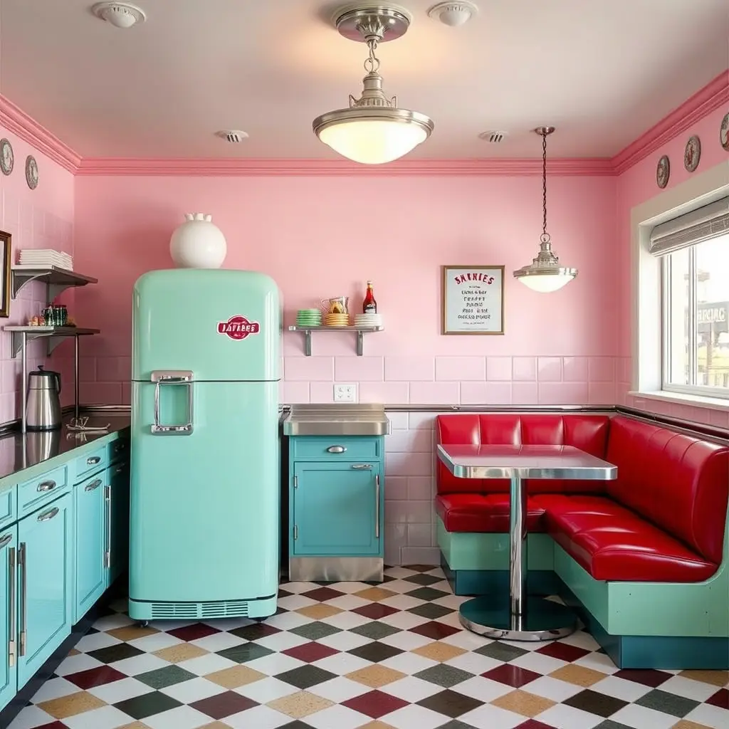 مطبخ على طراز مطعم علىنص الصورةنسخمطبخ على طراز مطعم على طراز الخمسينيات من القرن العشرين مزود بثلاجة بلون الباستيل والنعناع ومقصورة جلوس باللون الأحمر الكرزي وأرضية من بلاط رقعة الشطرنج وأسطح عمل مزينة بالكروم أبعاد الصورةمربع الموديل المستخدم Flux Fast العرض1024 الارتفاع1024 تاريخ الإنشاء07/09/2024 التطبيق المستخدم مولّد الصور تحميل الدقة الكاملةتعديل الصورةولّد صورة مشابهة0