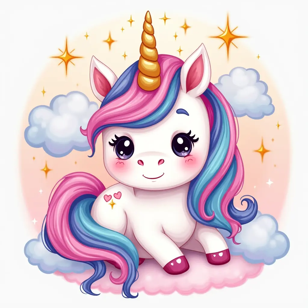 a cute pastel unicorn with a sparkling rainbow mane and golden horn, surrounded by soft clouds, stars, and gentle sparkles — dreamy lighting, watercolor style, kawaii face, magical and elegant atmosphere, perfect for a little girl’s birthday invitation, no text, high-quality illustration