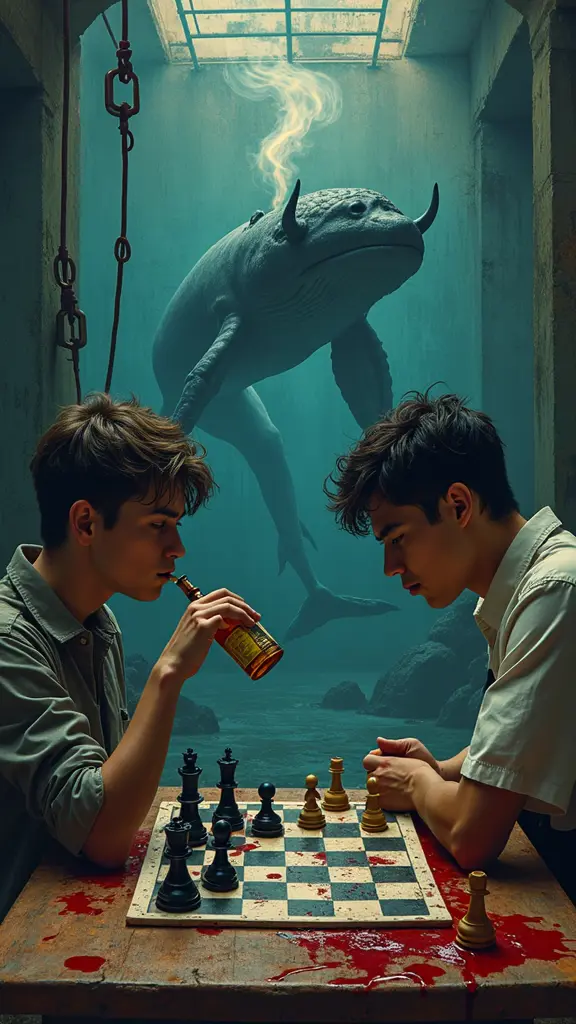 رواية بعنوان النوستالجيا مكتوبة بالخط العريض في أعلى الصورة، في زاوية الصورة السفلة مكتوب الكاتب غيث حموي، وصف الصورة شابين يلعبان الشطرنج وهما منهكان وعليهما آثار دماء، حوت بقرون الشيطان يدخن السجائر ، واغلال فولازية، زنزانة، كحول، شيئ خيالي أكثر يصلح لغلاف رواية جذاب، في السجن، تعذيب نفسي