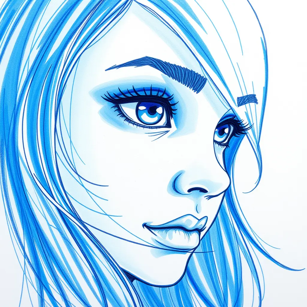 رسمة تجسد وجهًا ذو ملامح أنثوية أو شبابية مرسوم باستخدام درجات اللون الأزرق المختلفة. الوجه مرسوم بزاوية جانبية حيث يظهر بشكل مقرب للغاية على ورق به خطوط مربعات صغيرة. الملامح تركز بشكل خاص على العيون التي تبرز بشكل كبير ومليء بالتفاصيل، مع استخدام تقنيات التظليل والتلوين بالأزرق لتوضيح العمق. العيون واسعة ومعبرة، وفيها انعكاسات ضوئية لإبراز النظرة. الشعر طويل ومتطاير حول الوجه، مرسوم بخطوط حادة وسلسة، وكأنه يتحرك أو يتطاير في الرياح. الرسمة تتسم بالطابع الانسيابي والحركي، مع لمسات فنية دقيقة على الشعر والحواجب. استخدام اللون الأزرق يعطي انطباعاً بالحيوية والبرودة في ذات الوقت الخلفية لا تحتوي على تفاصيل معقدة، ولكنها تبرز بوضوح التأثير الفني المستخدم مع ظلال الشعر وتفاصيل الوجه