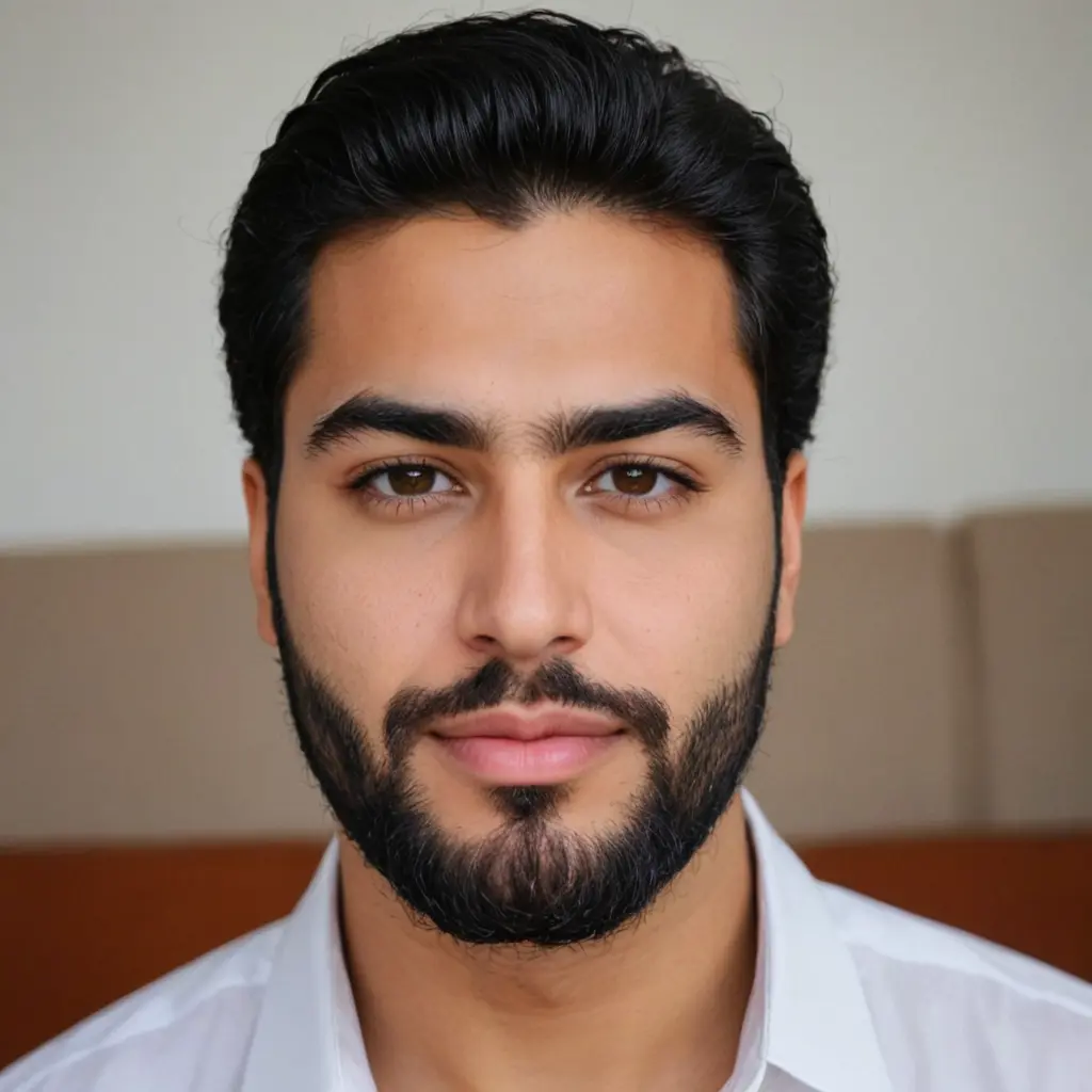 هل يمكنك صنع صورة لرجل بشرته بيضاء عربية ، وعيونه واسعة ورموشه جميلة ولون عيناه بني غامق وشعره مابين الويفي والستريت ووجة دائري حاد مع لحية كثيفة وشفتاه ورديه وحجمها متناسق وأنفه ليس بكبير ولا صغير وحواجبه متناسقة وجميلة وبدين وملامحة ليبية