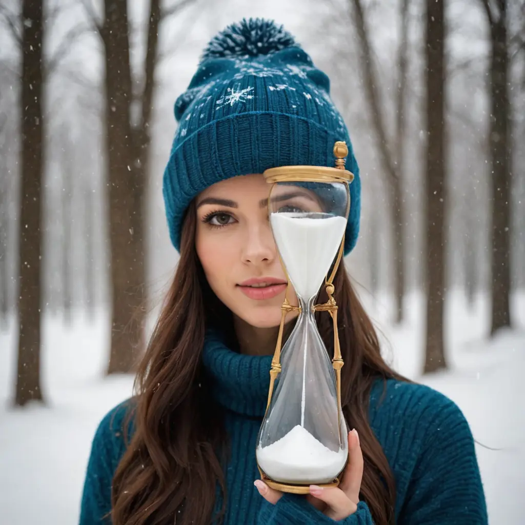ارسم ساعة رملية ترتدي قبعة شتوية، بحيث تبدو وكأنها في أجواء شتوية باردة. الساعة الرملية يجب أن تكون مصممة بحيث تظهر بوضوح، والقبعة الشتوية (آيس كاب) تغطي الجزء العلوي منها. خلفية الصورة تمثل أجواء شتوية، ربما مع بعض الثلوج أو الألوان الباردة لإضفاء الشعور بالبرودة والشتاء. تأكد من وجود تفاصيل في الساعة الرملية والقبعة لتبدو الصورة ممتعة وحيوية