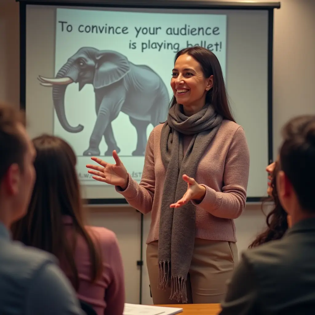 عايز صورة لمدربة تسويق مصرية بتشرح لطلابها و وراها شاشة مكتوب عليها تقنع جمهورك بـ إيه إن الفيل عادي يلعب باليه ! والطلاب بيضحكوا وتكون الصورة فيها عمق ألوان مع دفء في الألوان وتكون الآلوان واقعية وفيها لونين الرمادي والوردي تكون الصورة طولها 1200 عرضها 1200