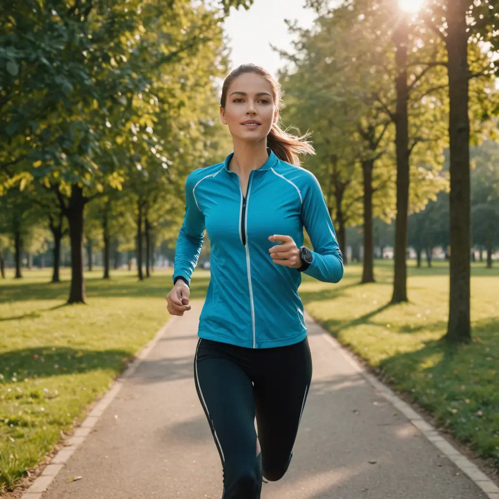 : شاب أو شابة يرتديان ملابس رياضية يمارسان الجري في حديقة أو على مضمار، مع سماعات لاسلكية متصلة بهاتف ذكي في اليد أو مثبت على الذراع، ويظهر خلفهما عناصر رقمية مثل إشعارات لعدد الخطوات والمسافة المقطوعة على شاشة افتراضية. في الخلفية، يمكن أن تظهر إضاءة ناعمة من أجهزة ذكية أو مباني حديثة للإشارة إلى التكنولوجيا المتقدمة المحيطة. .