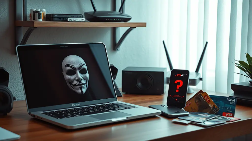 على المكتب جهاز لابتوب مخترق بملامح جاسوسية بشرية وإلى جانبه هاتف ذكي مخترق بملامح جاسوسية بشرية وإلى جانبهم بطاقات إئتمان بنكية فيزا كارت من المؤكد أنها مخترقة من الهاكرز كثيرا و على الرف فوقهم جهاز راوتر وايفاي متجسس له ملامح بشرية مخترق وألوان الصورة تظهر جو الإختراق والهاكرز بقناع الv for vendetta على كل تلك الأجهزة ولا يوجد أشخاص