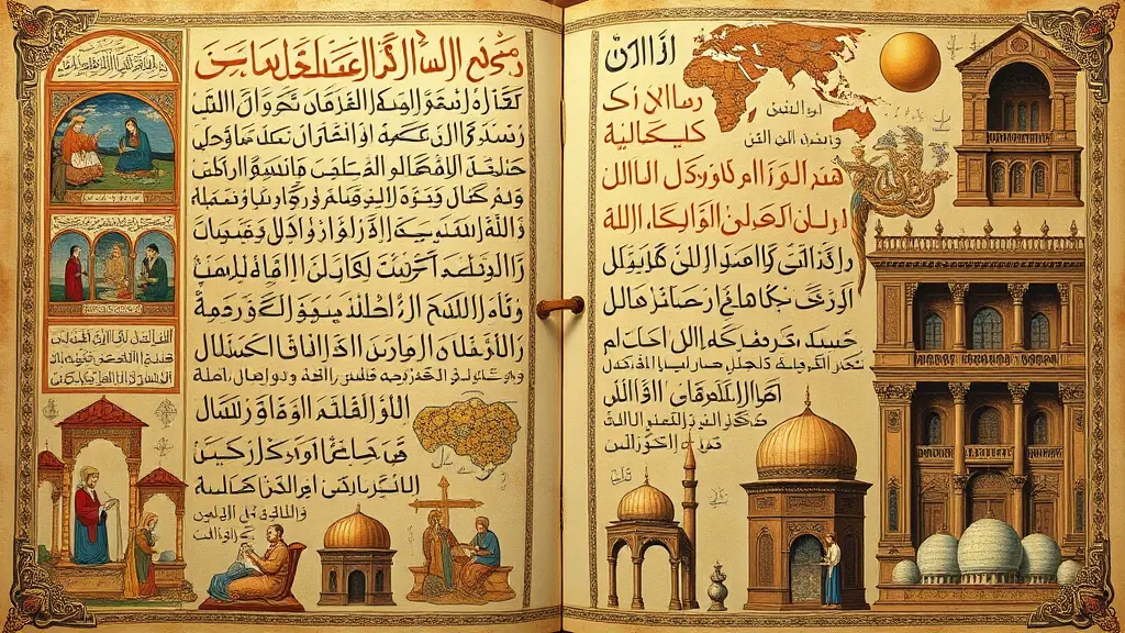 "صورة تعبر عن موسوعة التاريخ الإسلامي: مخطوطات عربية قديمة، خطوط ذهبية، مشاهد من حضارات إسلامية عبر العصور (الأموية، العباسية، الأندلسية)، علماء يكتبون، خرائط للعالم الإسلامي، عمارة إسلامية مثل المساجد والمكتبات."