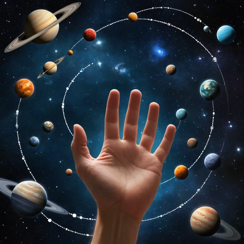 في الفضاء العميق، تظهر صورة معلم في وسط الصورة ، يطفو بين الكواكب العشرة الموزعة في الخلفية. كل إصبع من أصابع المعلم يخرج منه سلسلة طويلة، تتدلى في الفضاء وتلتف حول الكواكب المختلفة، وكأنها متصلة بها بشكل مخيف. الكواكب تتوزع بشكل عشوائي أمام المعلم ، مع ألوان مختلفة وإضاءات متوهجة لإضفاء المزيد من التأثير البصري. المعلم نفسه يتسم بملامح هادئة، مما يجعله يبدو وكأنه كائن قادم من عالم آخر. النجوم تضيء في الخلفية، مضافةً مزيداً من العمق والتفاصيل للفضاء.