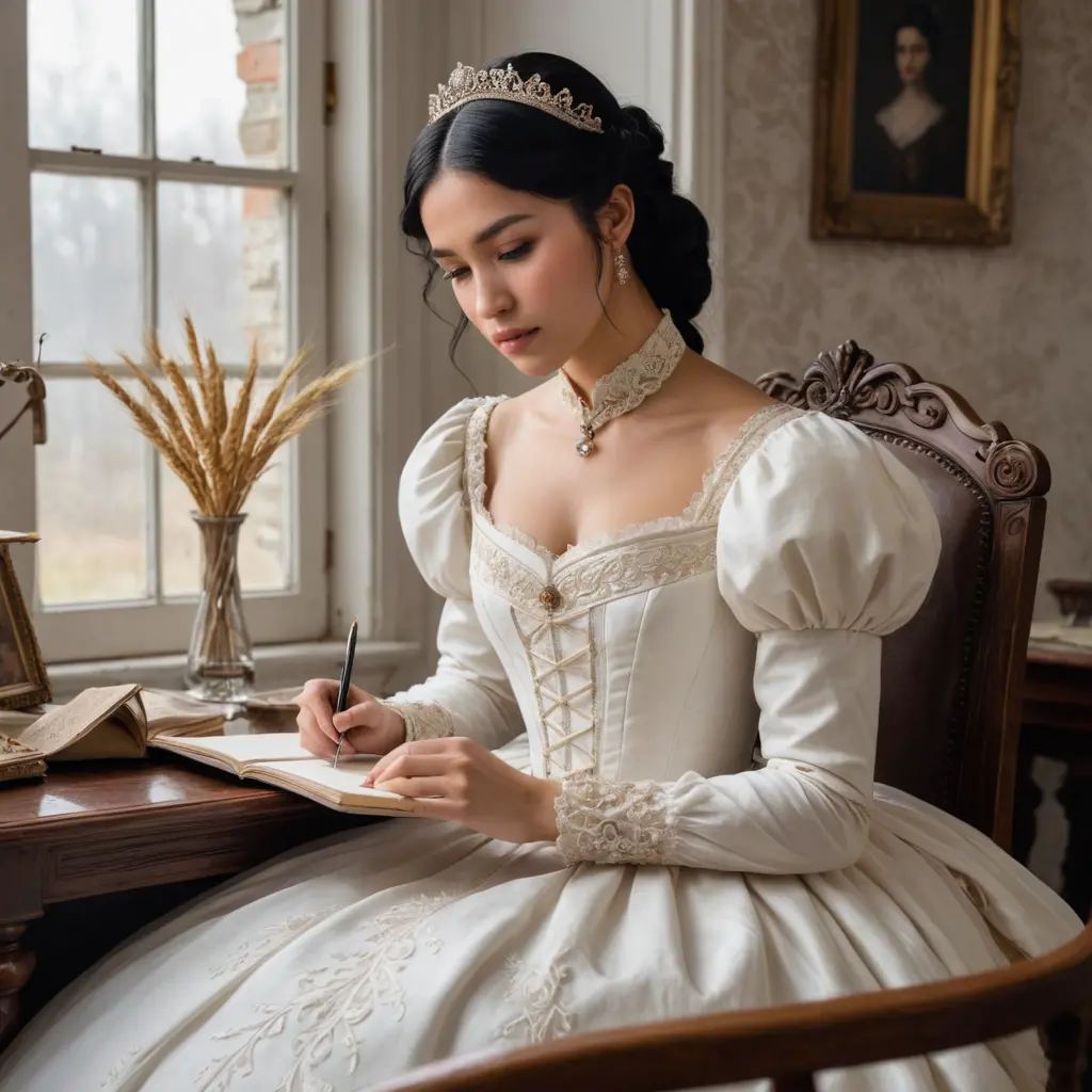 أميرة ذات شعر اسود وبشرةنص الصورةنسخأميرة ذات شعر اسود وبشرة حنطية وعينان بنيتان ترتدي فستانًا من العصر الفيكتوري باللون الابيض تقوم بالكتابة أبعاد الصورةمربع الموديل المستخدم SDXL العرض1024 الارتفاع1024 تاريخ الإنشاء03/10/2024 التطبيق المستخدم مولّد الصور تحميل الدقة الكاملةتعديل الصورةولّد صورة مشابهة0