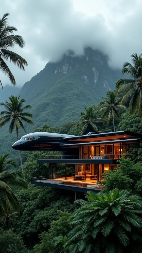 منزل عصري فاخر متكامل مع هيكل طائرة سوداء أنيقة، وسط غابة استوائية خصبة. تمتد أجنحة الطائرة فوق الهيكل، وتمتزج بسلاسة مع الهندسة المعمارية. يحيط بالمشهد أشجار النخيل الطويلة وأوراق الشجر الخضراء الكثيفة، مع خلفية جبلية درامية مغطاة بسحب ضبابية. يتناقض الإضاءة الدافئة للمنزل بشكل جميل مع الجزء الخارجي المظلم من الطائرة والخضرة الغنية المحيطة بها، مما يخلق أجواء سريالية وفاخرة.