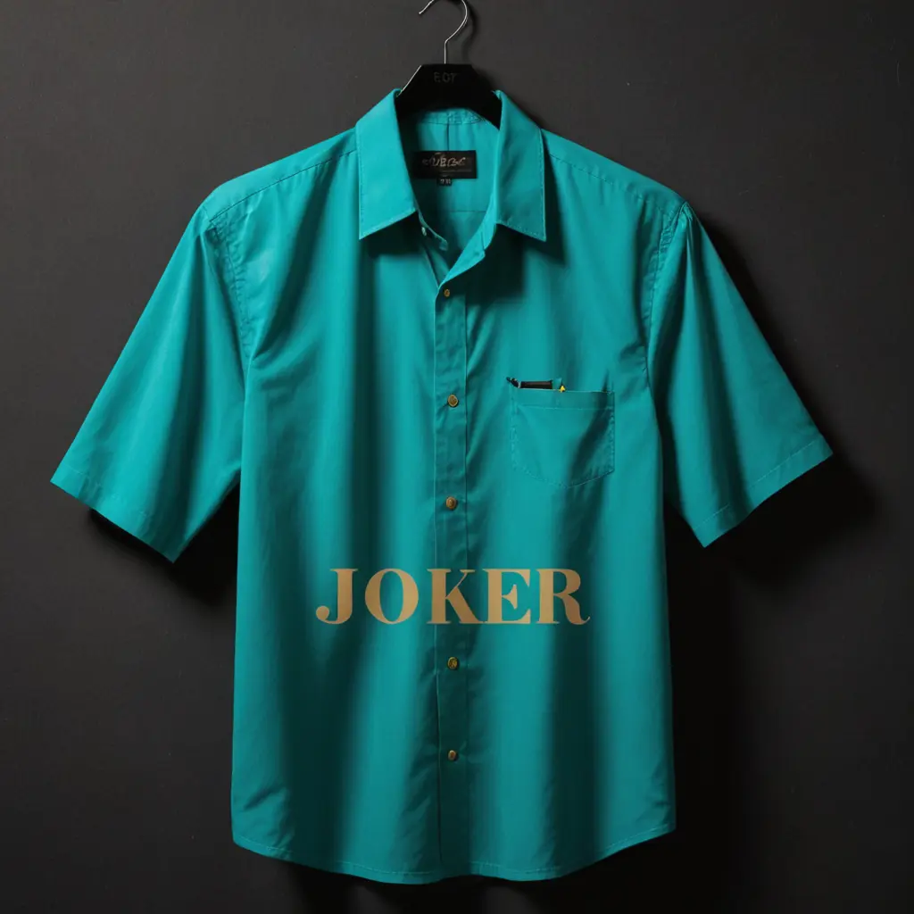 الصورة تُظهر شعارًا على خلفية داكنة. الشعار يحتوي على قميص رجالي تركوازي أنيق معلق على شماعة على اليسار، وعلى اليمين يوجد نص "JokER" بحروف كبيرة باللون الذهبي، وتحتها توجد "نفس الاسم بحروف أصغر وباللون الذهبي أيضًا. التصميم أنيق ويبدو أنه يركز على الموضة أو الملابس، مما يجعله مناسبًا لعلامة تجارية أو مشروع في صناعة الأزياء.