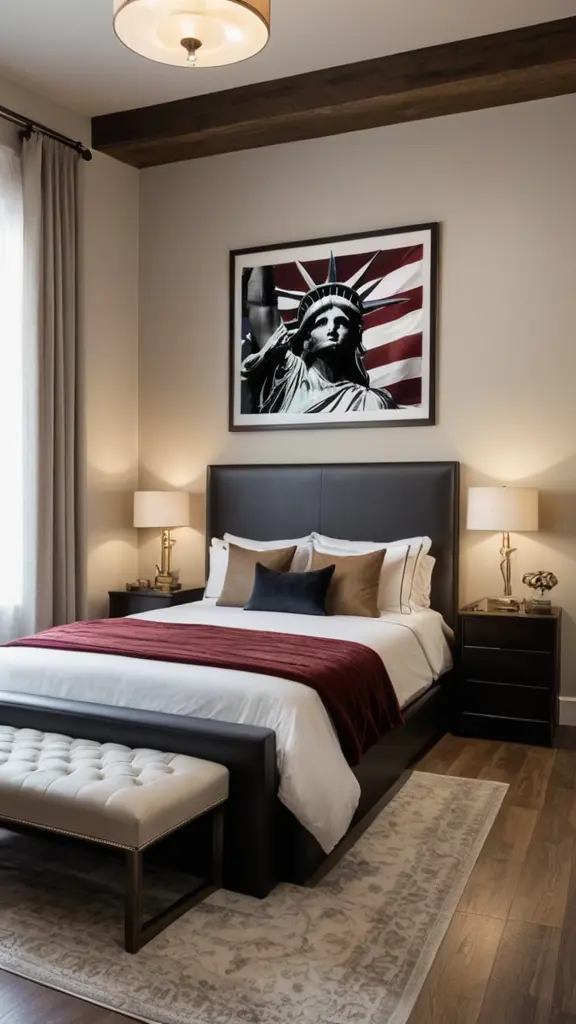 غرفة نوم بطراز أمريكي تجمع بين العصرية والدفء. الجدران رمادية مع لمسات بيضاء، والسقف يحتوي على عوارض خشبية داكنة. السرير مزين بمفرش بألوان العلم الأمريكي مع وسائد من الجلد والمخمل. الجدران مزينة بصور معالم شهيرة مثل تمثال الحرية وجسر جولدن جيت، وملصقات أفلام كلاسيكية. الطاولات الجانبية تحتوي على مصابيح صناعية من النحاس والحديد، والستائر البيضاء الشفافة تسمح بدخول الضوء الطبيعي. الأرضية خشبية داكنة مع سجادة محايدة، وزاوية قراءة مريحة بكرسي جلدي ومصباح كلاسيكي، مما يضفي على الغرفة طابعًا أنيقًا ودافئًا.