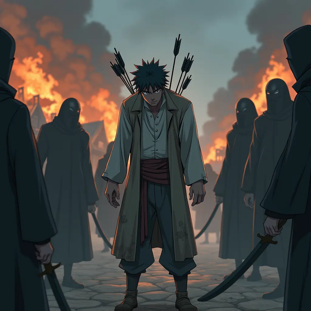 صوره انمي رجل منهك بسهام متعددة تخترق ظهره، رأسه منخفض من التعب، يرتدي ملابس فلاحية ممزقة في قرية مزقتها الحرب حيث يتصاعد دخان كثيف داكن من المنازل المحترقة، ويحيط بالقرية بضباب مشؤوم. إنه محاط بأعضاء لا يرحمون من منظمة شريرة، عباءاتهم وأقنعتهم السوداء تتناقض بشكل صارخ مع ملابس القرويين المتواضعة، حيث يهاجمونه بلا رحمة بالسيوف المسلولة. صوره انمي الرجل معضل سيفه على الارض