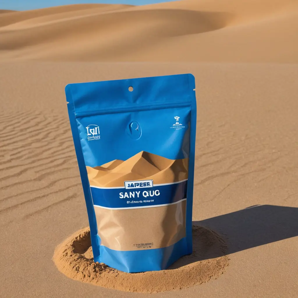 أريد صورة لمسحوق باللون الرمادي اازرق موضوع في حقيبة كرافت زرقاء من الاطار بسحاب ونافذة المنتج شفافة كاملة من الأعلى إلى الاسفل. حيت ممكن ان ترى المسحوق بالداخل في صحراء رملية بدون ملصق علة المنتج . اعكس الألوان بين المسحوق ولون الحقيبة. خلفية صحراء رملية