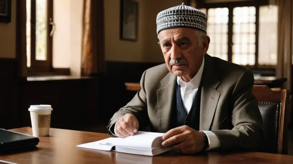 أنشئ لي صورة واقعية لرجل عربي مسن -يجلس خلف طاولة خشبية، -يلبس طاقية اسلامية بيضاء -الطاولة ذات لون خشبي غامق ارتفاعها بحدود 80سم يتوسطها من الأمام تنجيد قماش اسود، يعلوها عدة دفاتر وقرطاسية وعلبة محارم. - الرجل يجلس خلف الطاولة على كرسي كبير ولا يظهر الا نصف الرجل الاعلى، يلبس الرجل قلابية ذات لون رصاصي مقلمة بخطوط سوداء على شكل مربعات، يلبس طاقية صغيرة - الى يساره طاولة ذات ثلاث دروج، لون الطاولة بني غامق والدروج بني فاتح. -يعلو الطاولة عدادة نقود والى جانبها حافظة قهوة. - الخلفية عمال مطعم بخلفية مشوشة . -الاضاءه جيدة من انعكاس الشمس الوارد من الشارع. -صورة ذات واقعية مفرطة - فتحة العدسة 2.8 -تصوير كانون. -تصوير سينمائي. -التصوير من اليسار، زاوية واسعة