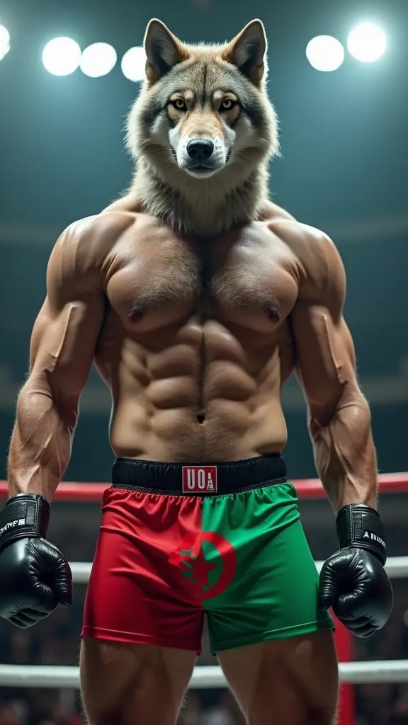 الصورة تُظهر مقاتلًا قوي البنية في حلبة القتال، يتميز بجسم رياضي ضخم وعضلات مشدودة وضخمة، يظهر الجسم بالكامل مرتديًا قفازات قتالية وسروالًا قصيرًا مستوحى من (علم دولة الجزائر) . المقاتل يبدو غير تقليدي، حيث يمتلك رأس ذئب بدلاً من رأس إنسان، مع مظهر مهيب وأسطوري. الأضواء الساطعة في الخلفية تضيف إلى جو المنافسة والتحدي، مما يوحي بأجواء معركة ملحمية في رياضة المصارعة