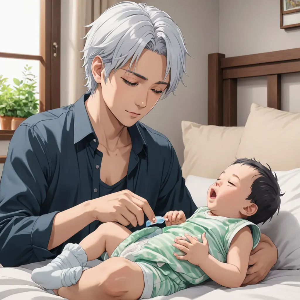 صور متقاطعه وباسلوب أنمي يقوم فيا شاب ب اعتنى بطفل رضيع بأسلوب أنمي حيث يقوم في أول صورة بإطعام الطفل باستخدام رضعه والثانية يقوم بحمل الطفل والثالثه يقوم بتغير حفاظه و إلباسه حفاظ جديد والرابعة والطفل يبكي والخامسة والطفل نائم في سرير الأطفال وباسلوب أنمي الشاب أبيض الشعر وازرق العيون و الطفل أسود الشعر واخضر العيون وتكون الصور متقاطعه وباسلوب أنمي