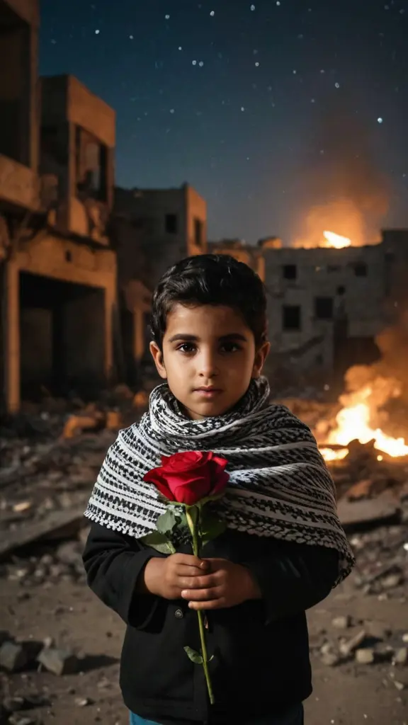 طفل يلبس الكوفية الفلسطينية ويحملنص الصورةنسخطفل يلبس الكوفية الفلسطينية ويحمل وردة وينظر الى المباني المقصوفة والمدمرة وتشتعل فيها النيران ومن بعيد موجود علم فلسطين ، في الخلفية الاجواء ليلية وتظهر فيها النجوم وشهب ، صورة عميقة جداً أبعاد الصورةعمودي الموديل المستخدم SDXL العرض576 الارتفاع1024 تاريخ الإنشاء12/09/2024 التطبيق المستخدم مولّد الصور تحميل الدقة الكاملةتعديل الصورةولّد صورة مشابهة0