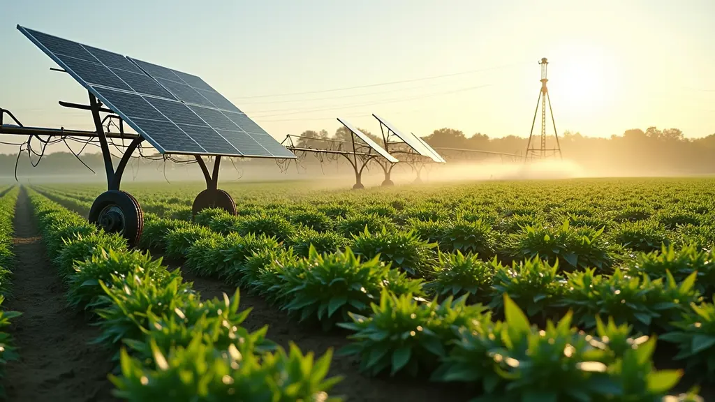 الصورة الأساسية: أرض زراعية تحتوي على مرشات محورية Pivot تقدر تعمل سيرش وتجيب احسن صورة فيها البيفيت في الخلفية). الواح شمسية من Jinko Solar لونها أسود) مدمجة مع المشهد . Veichi Pump Inverter يظهر بوضوح ضمن التصميم كابلات كهربائية (واحد) أسود والآخر أحمر) والكابلات مرفقة مع الـ Drive .
