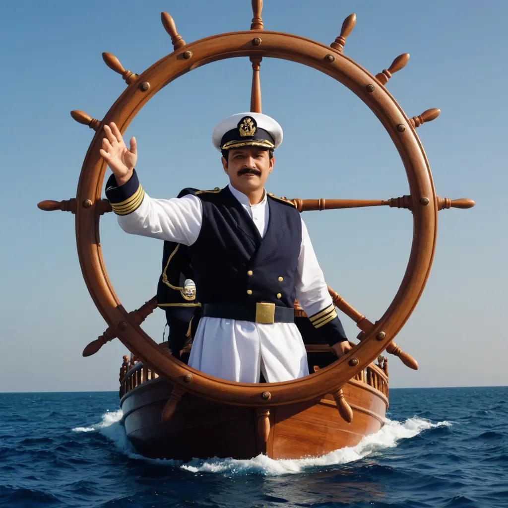 صمم تصميم يعبر عن قائد يستخدم قانون الملاحه في القياده يمكن ان يكون التصميم عباره عن قائد يمسك بدفه قياده سفينه ضخمه نحو اليابسه واريد ان يكون البحر هائج ومليئ بالتحديات أريد القائد في مكان قياده السفينه بملابس عربيه اكتب نص علي الصوره "القائد هو اللي بيرسم الطريق"