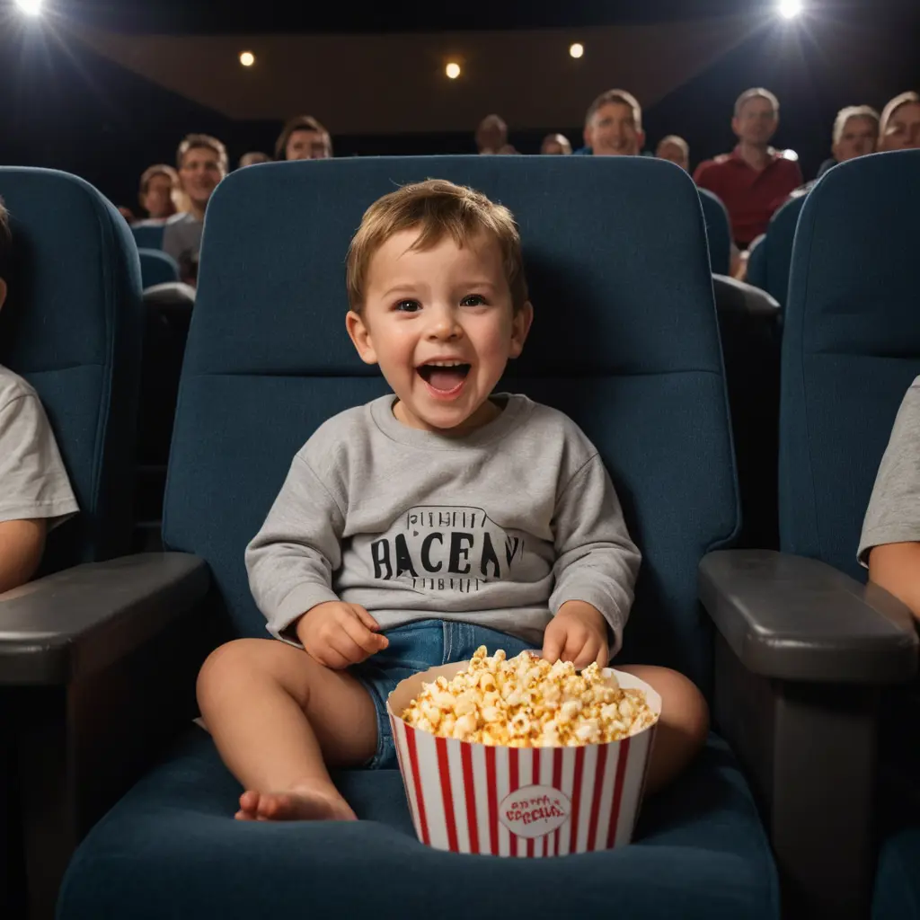 طفل يجلس على كرسي سينما كبير، يرتدي حفاضة فقط، ويمسك بيده الصغيرة علبة فشار. ويظهر على وجهه السعادة والإثارة، وعيناه واسعتان متلألئتان تستمتعان باللحظة. يؤكد الكرسي الكبير الحجم على صغر حجم الطفل، وتوحي الخلفية الخافتة بأجواء السينما، مع إضاءة ناعمة ومقاعد أخرى مرئية من مسافة بعيدة.