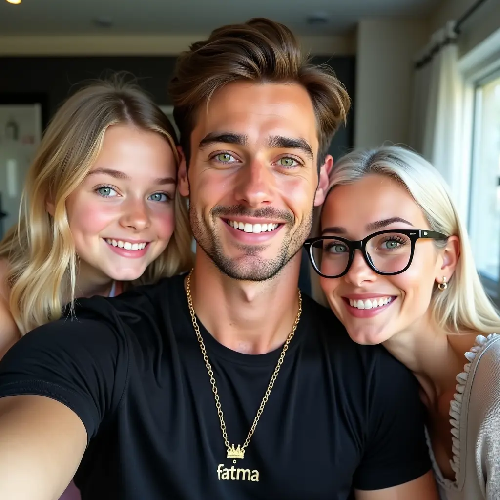 شاب وسيم ذو ملامح جميلة فكه بارز العظام و هو حاد و عريض لون عيناه اخضر و عيونه مسحوبة ذات رموش طويلة جسده بارز العضلات بشكل ضخم جدا و يرتدي قلادة تعني اسم fatma و يرتدي تيشيرت اسود يلتقط صورة مع فتاتان جميلات شعرهم اشقر و عيونهم خضراء و جدته التي ترتدي نظارة و شعرها ابيض الصورة ذاتية قريبة من الاوجه فقط